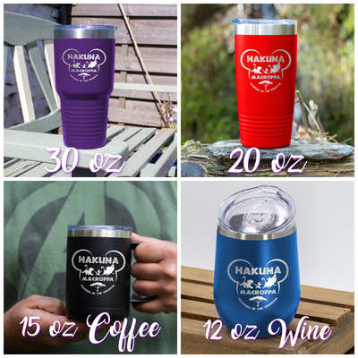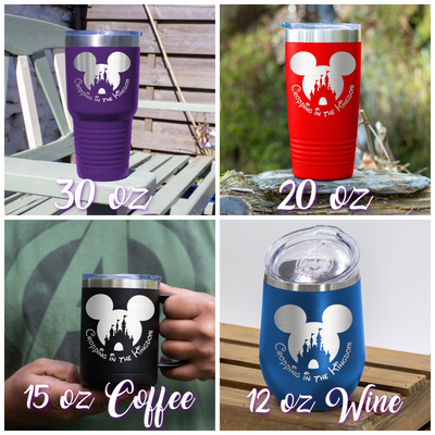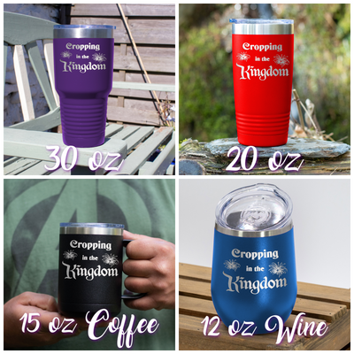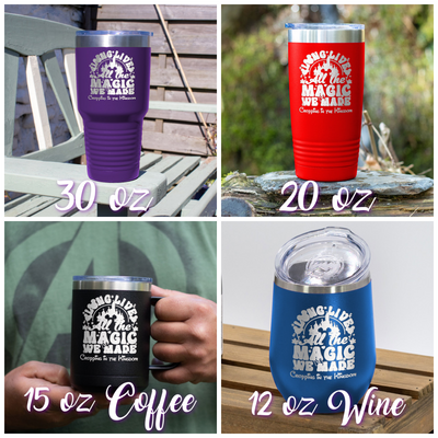 Available in a large 30 oz, med 20 oz, 15 oz coffee, and 12 oz wine styles. The Large & Medium have a narrower bottom to fit most standard cup holders! The coffee mug comes with a slider lid.
