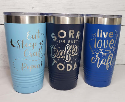 If you love crafting, these tumblers are for you! Choose a witty saying that describes your craftiness. Optionally add your name or another saying on the back and you're ready to be refreshed while you craft your day away!