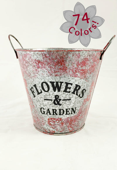 What a great way to add a touch of rustic country to your home, garden, wedding, or bridal shower! This cute tin bucket is a sturdy little thing with 2 handles. "Flowers & Garden" is printed on both sides. The print is slightly offset from the center of the handles giving it a cute & quirky look.