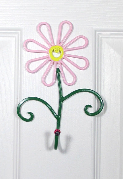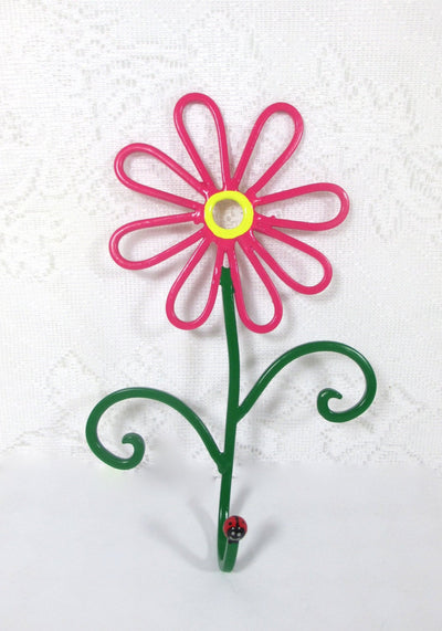 This metal flower hook has been hand-painted to look like a daisy. It's been painted with enamel paints with hot pink petals, a green stem & leaves, yellow stamen, & a sweet little ladybug! It was then given a coat of clear gloss to preserve the finish.